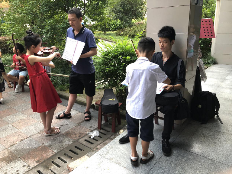 在考级现场,音乐类考生在考场外专心地复习着自己的考试曲目。舞蹈考生个个打扮得漂漂亮亮,画着淡妆在考场外伸腰拉腿,为考级做最后的准备。考场外家长们也积极为孩子助力。考场外,不少器乐类考生进行着最后的练习,不少家长一手拿曲谱,一手用扇子给孩子扇着风。