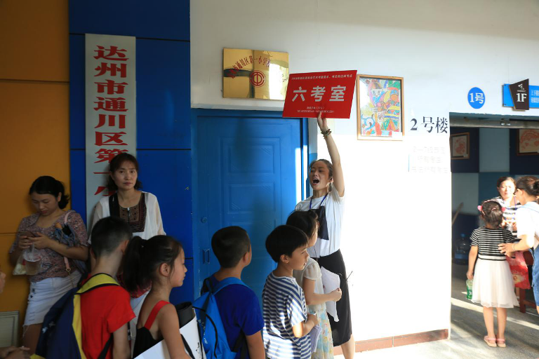 监考老师举着引领牌有序的带领学生进入考室
