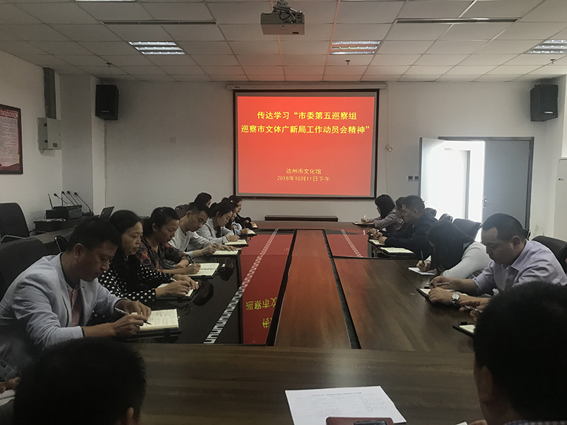 市文化馆于2018年10月11日下午,传达贯彻市委第五巡察组巡察市文体广新局工作动员会精神,学习了市委第五巡察组组长杜泽权同志的动员讲话,市委巡察工作领导小组成员、市委组织部常务副部长罗显泽同志的要求,市文体广新局李冰雪同志的表态发言。