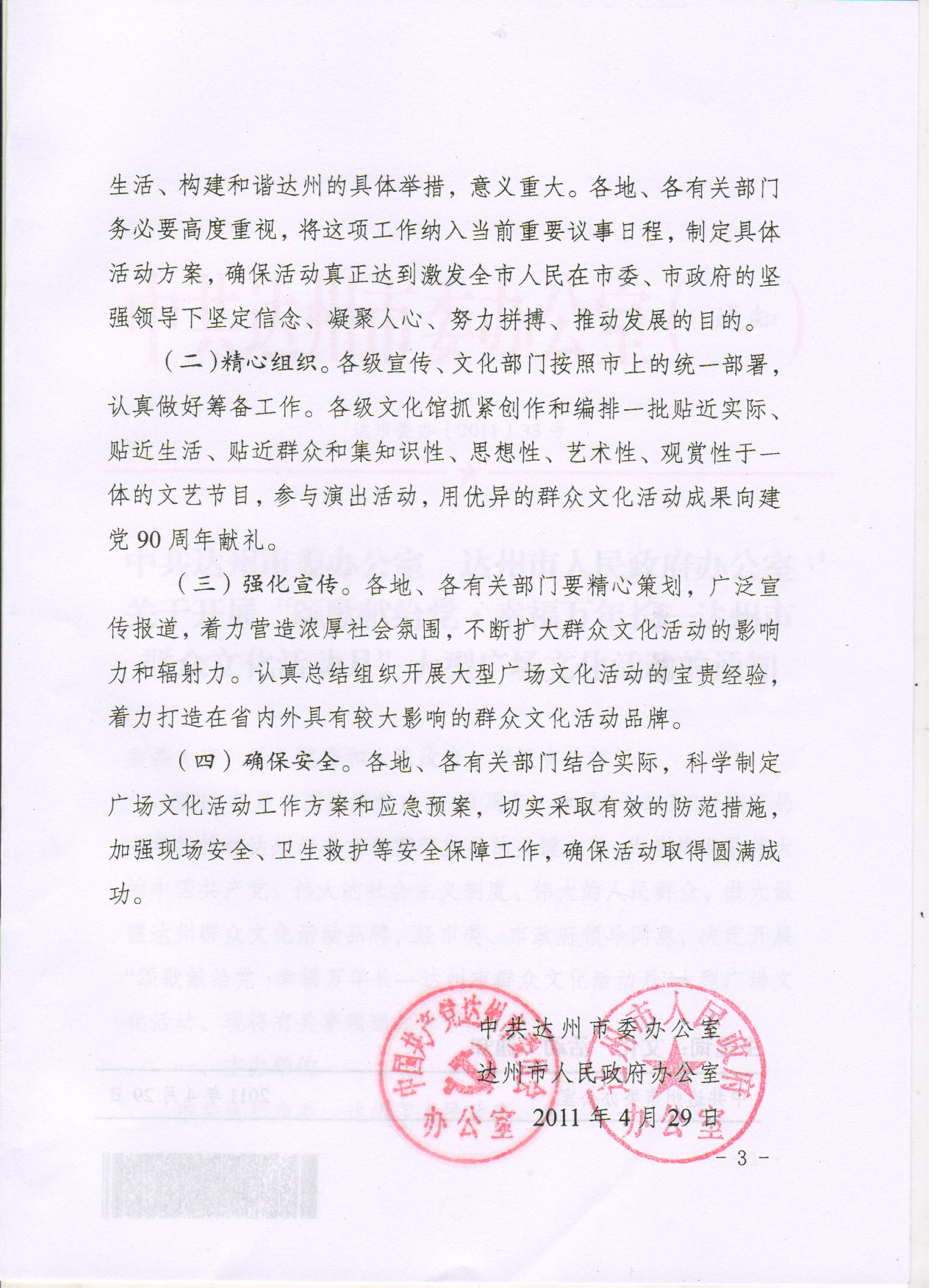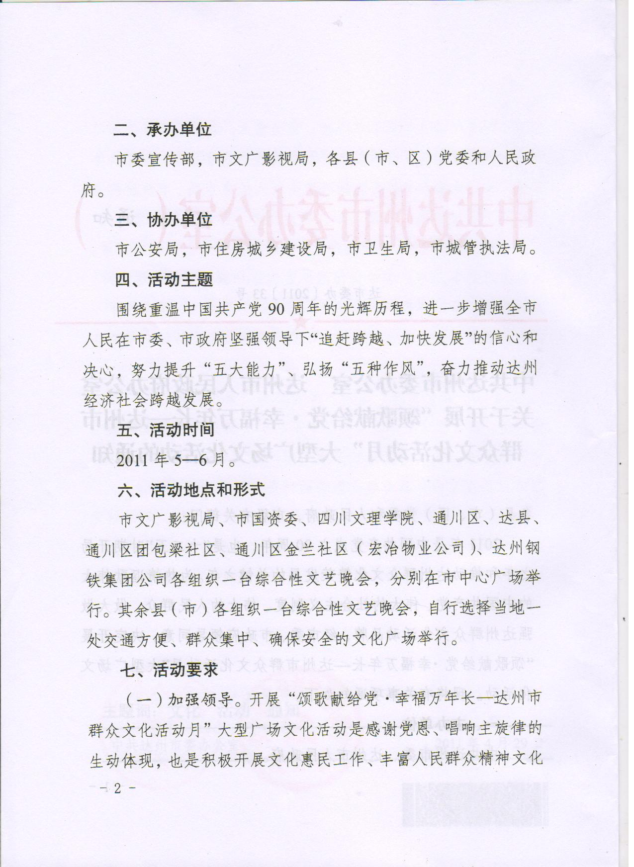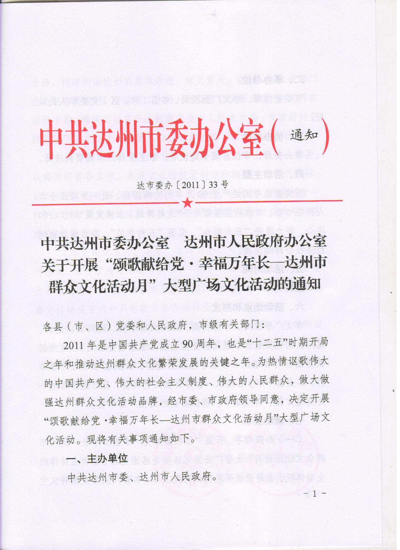 中共达州市委办公室 达州市人民政府办公室关于开展“颂歌献给党•幸福万年长—达州市群众文化活动月”大型广场文化活动的通知