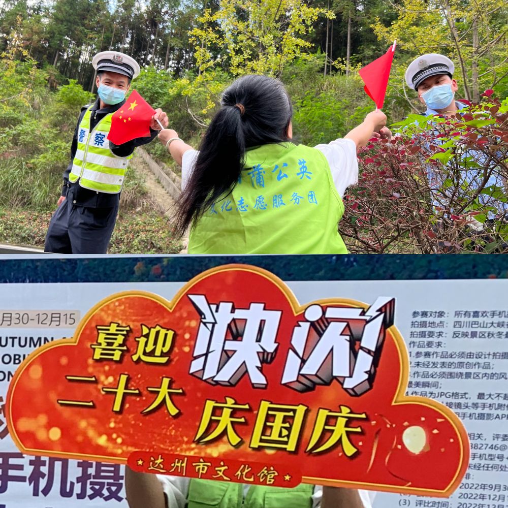 喜迎二十大·“快闪”庆国庆。10月1日-3日,达州市文化馆“快闪”小分队分别在巴山大峡谷景区、万源茶文化小镇、八台山景区、莲花湖风景区开展“快闪”活动17场,游客参与1600余人次。文艺工作者们用最优美的歌声、最曼妙的舞蹈,强烈的仪式感,丰富的互动感,十足的现代感,引发了游客情感共鸣,一起哼唱悠扬的旋律。其间还组织开展了“我在达州为祖国生日打call”的主题活动和驾驶无人机悬挂国旗飞越巴山大峡谷为祖国母亲庆生的航拍活动。