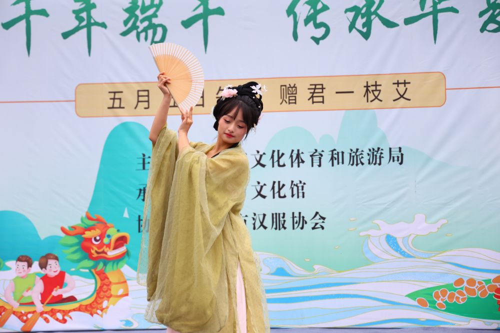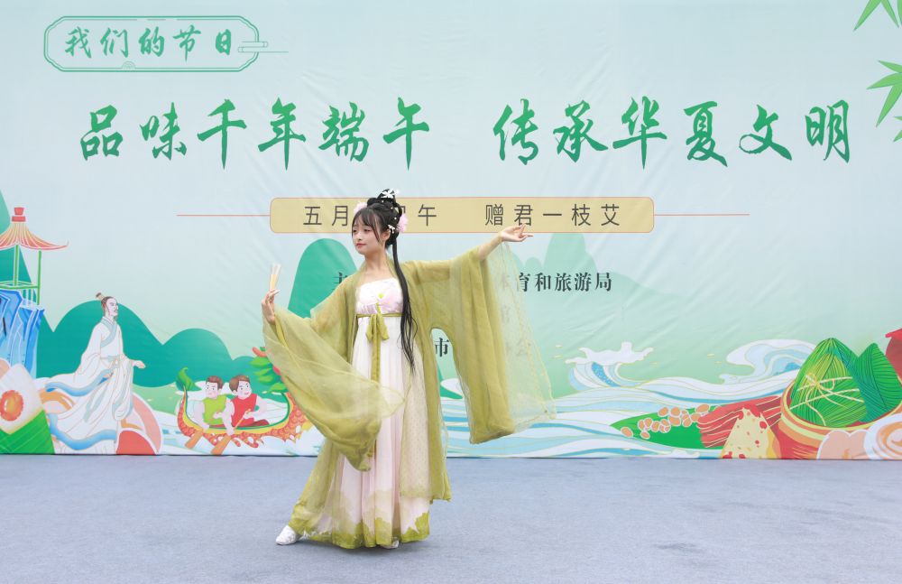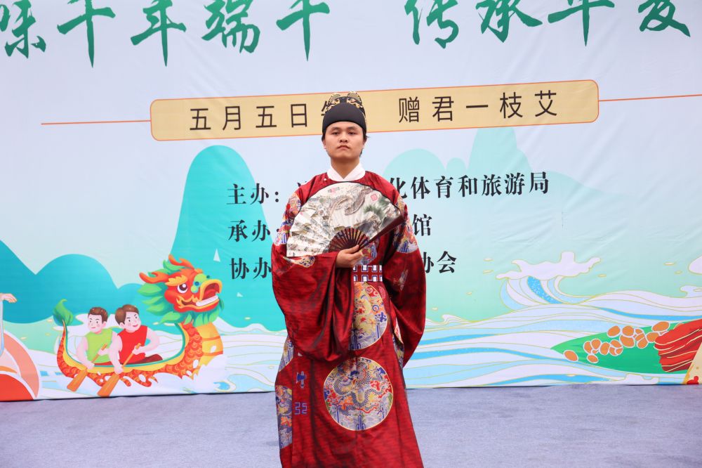 “清明插柳,端午插艾”,在民间,端午节有借艾叶、菖蒲祛毒防疫、预防疾病的传统习俗。演出现场,由穿着汉服的端午仙子不时为在场群众进行沐兰汤(祓禊)活动,用菖蒲、艾叶草沾着盆里的艾叶水,在双手、额头、脖颈轻轻拂拭一下,以示驱灾辟邪。