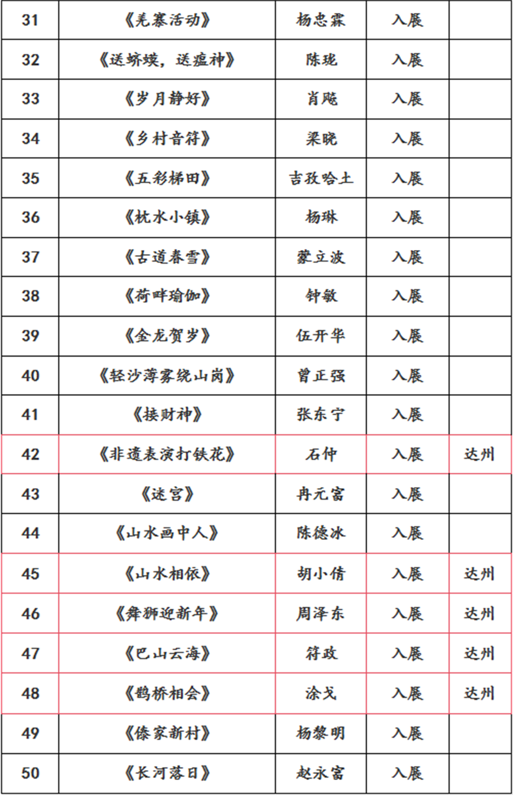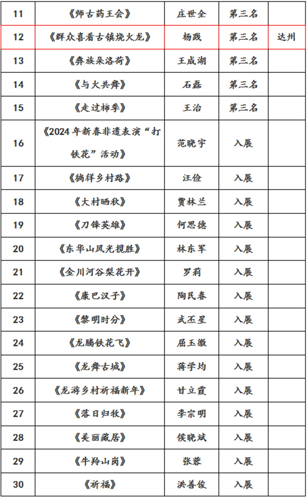 由四川省文化馆、陕西省文化馆、甘肃省文化馆、四川省摄影家协会举办的“美景·秘境”川陕甘文旅摄影精品联展四川征集作品经过初评、终评等环节,最终评选出50件获奖及入展作品,我市共有8件作品获奖、入展。其中1件作品获第一名(第一名共3件作品)、1件作品获第二名(第二名共5件作品)、1件作品获第三名(第三名共7件作品)、5件作品入展(入展共35件作品)。