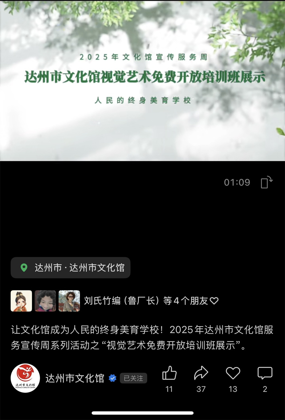 2025年文化馆服务宣传周,达州市文化馆特别推出了线上活动之“视觉艺术免费开放培训班展示”,以动态影像记录、课程实录剪辑、学员风采展示等形式,对国画、书法、摄影等多个艺术门类培训课程进行全方位呈现,受到了广大群众的点赞与转发。此次活动不仅是全民艺术普及的阶段性成果汇报,更是达州市文化馆践行“让文化馆成为人民的终身美育学校”使命的生动实践,为构筑城市精神高地注入了源源不断的活力。