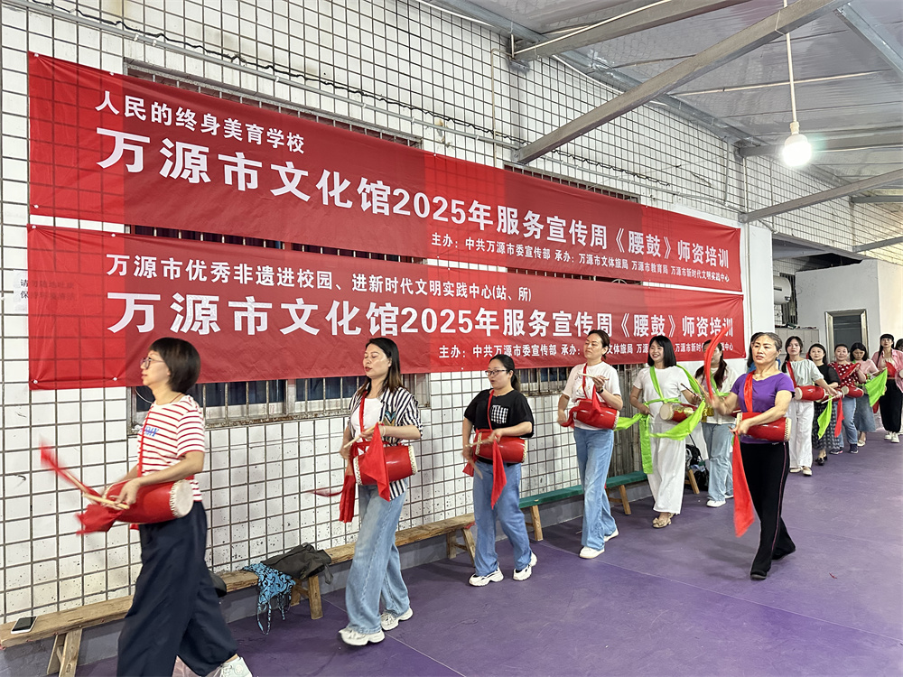 万源市文化馆:万源市文化馆以文化馆服务宣传周为契机,启动“非遗薪火传承计划”,围绕《太平腰鼓》《钱棍》《剪纸》三大特色项目开展师资培训,着力打造非遗传播“先锋队”。活动汇聚全市30余所中小学、10余个新时代文明实践中心及民间艺术团骨干近百名学员,通过理论讲授、实操演练、教学研讨等形式,为非遗活态传承厚植人才根基。