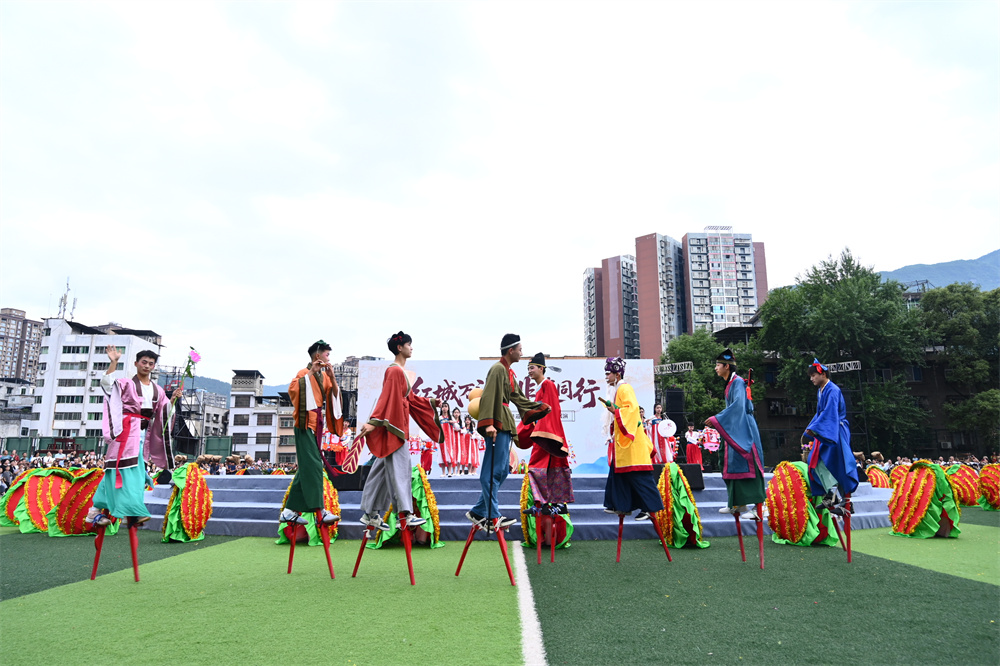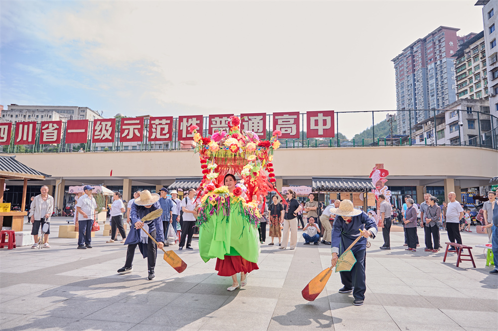 文艺演出在达州市级非遗项目《彩龙船》的精彩暖场表演中拉开帷幕。来自万源市玉带乡的彩龙船表演队身着绚丽多彩的民族服饰,摇曳着精致的彩色小船,翩翩起舞。他们婉转悠扬的歌声宛如天籁之音,直叩观众心扉,瞬间吸引了全场观众的目光,为整个活动营造了浓厚的文化氛围。