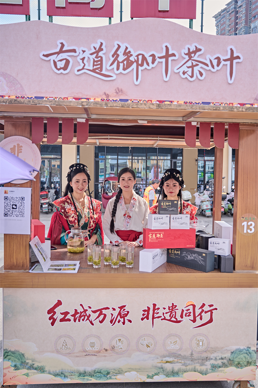 在演出如火如荼进行的同时,万源中学校外的广场上也热闹非凡。万源市的非遗产品展示区人头攒动,腊肉、茶焗猪肝、茶叶、豆瓣酱、佬万源罐儿鸡等十七项非遗产品同时亮相展出。这些展品以其独特的制作工艺和地道的风味,吸引了广大市民的驻足观看和踊跃购买,现场共成交 1000 余单,不仅让非遗产品走进了千家万户,也为非遗文化的传承与发展注入了新的活力,实现了文化传承与经济发展的双赢。