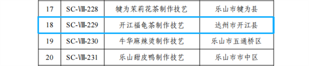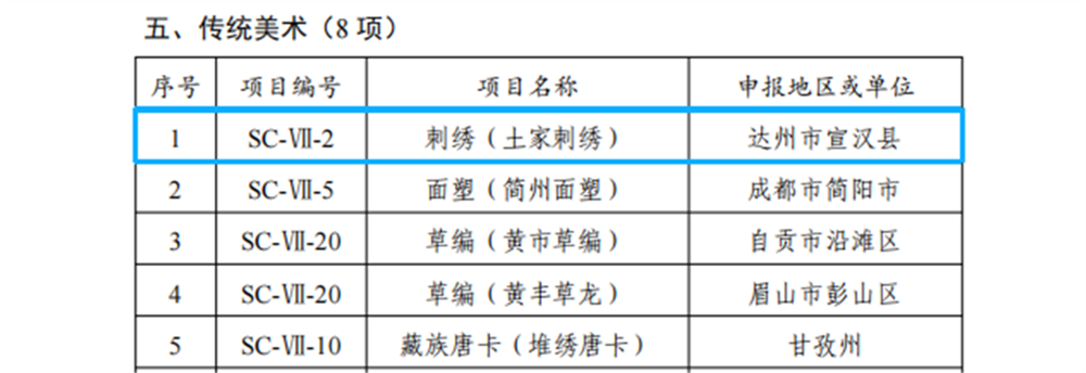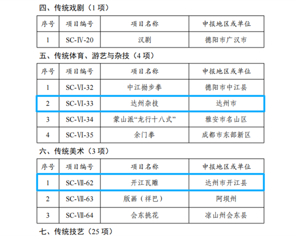 12月25日四川省人民政府正式公布四川省第七批省级非物质文化遗产代表性项目名录和省级非物质文化遗产代表性项目名录扩展项目名录,我市5项非遗项目名列其中。 传统体育、游艺与杂技类达州杂技、传统美术类开江瓦雕、传统技艺类开江福龟茶制作技艺成功入选四川省第七批省级非物质文化遗产代表性项目名录;传统音乐类四川耍锣鼓(宣汉耍锣)、传统美术类刺绣(土家刺绣)成功入选四川省第七批省级非物质文化遗产代表性项目名录扩展项目名录。