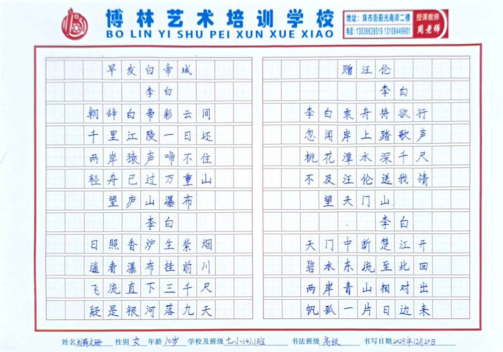 《古诗四首》 刘薛文珊 10岁 指导教师:周海明