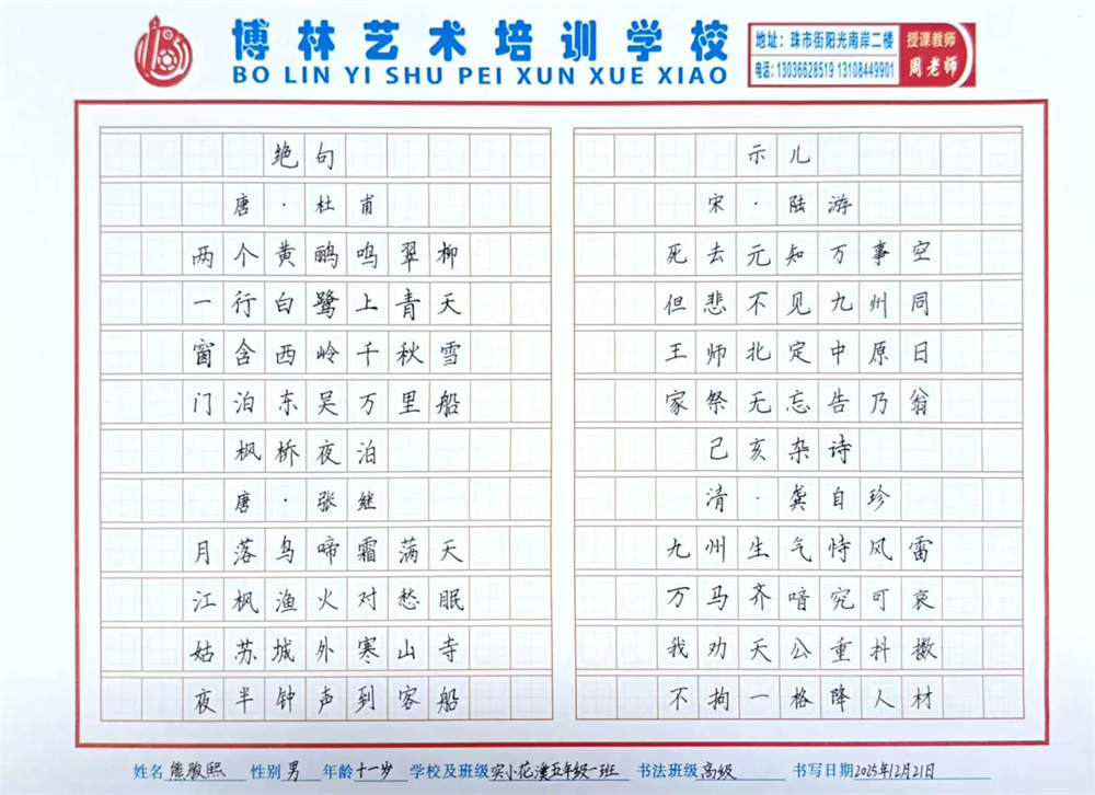《古诗四首》熊骏熙 11岁 指导教师:周海明