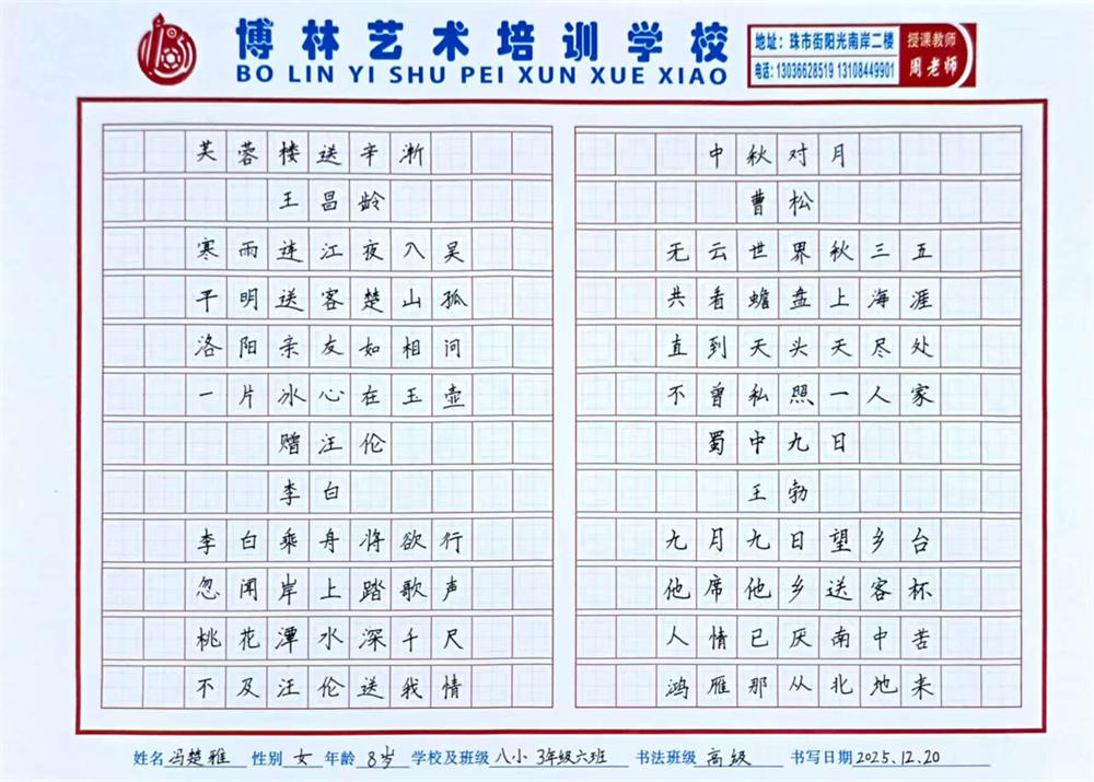 《古诗四首》 冯楚雅 8岁 指导教师:周海明