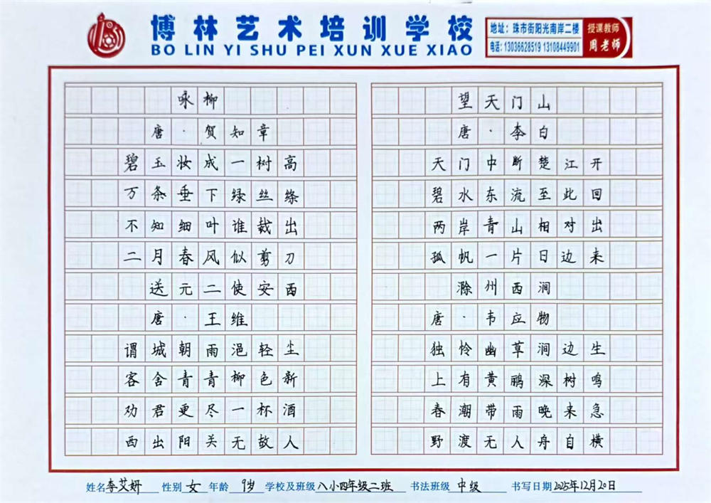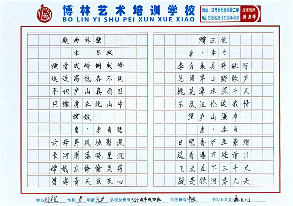 《古诗四首》 刘洋呈 9岁 指导教师:周海明