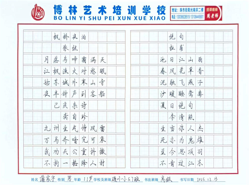 《古诗四首》 蒲宸宇 11岁 指导教师:周海明