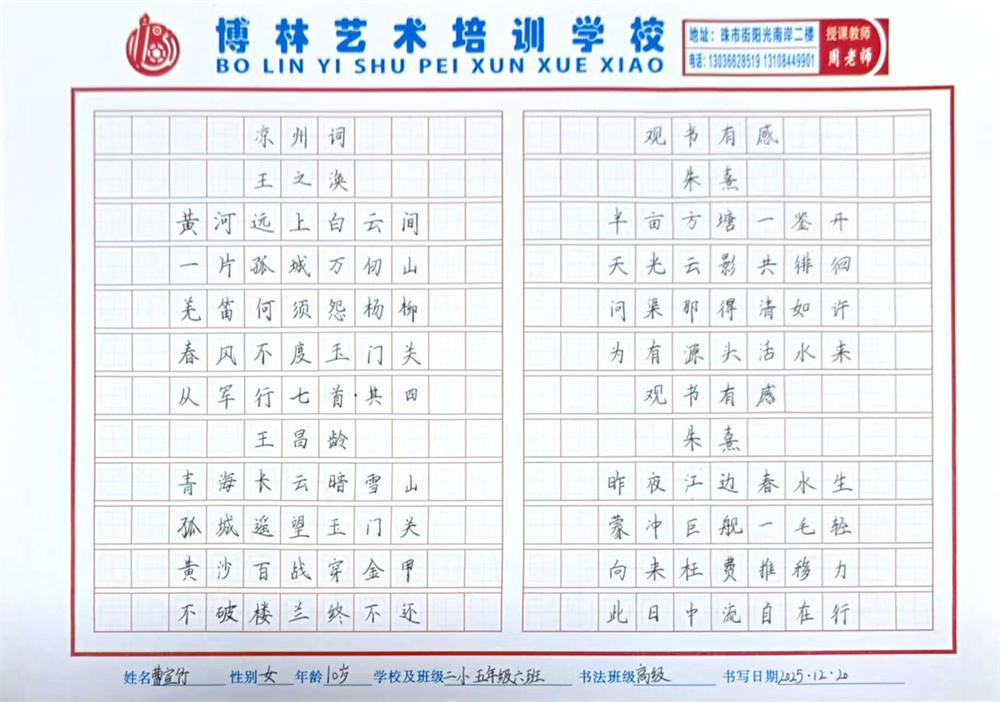 《古诗四首》 曹宣竹 10岁 指导教师:周海明