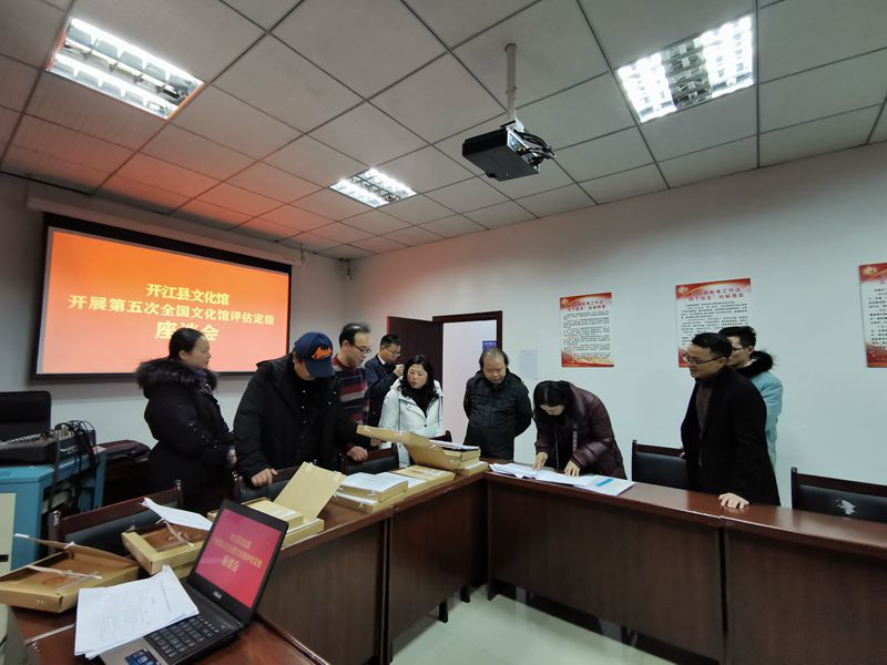 根据我县在线上自评中馆舍硬件建设滞后的实际情况,考评组首先驱车直到我县城普新区水文化广场实地查看开江县文化馆整体搬迁建设项目的规划实施,听取了世斌副县长关于我县新馆建设项目推进情况,并对我县高标准建设群众文化阵地给予了充分肯定。随后,考评组一行到开江县文化馆的舞蹈排练厅、书画展览厅、声乐试听室、多媒体室及免费开放场地等处考察调研,每到一处便驻足观看,详细询问,并对文化馆的硬件设施、经费开支、队伍建设、活动开展、辅导培训等方面相关材料逐一进行查阅核实。县文体旅游局局长蒋兴芬从馆办条件、业务建设、服务效能、提高指标及存在的问题等自查自评情况作了相关汇报。