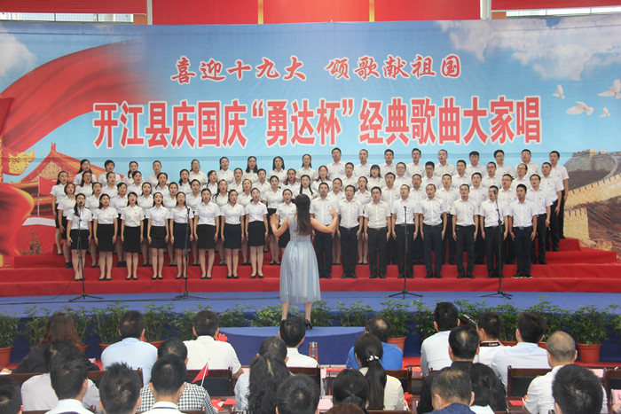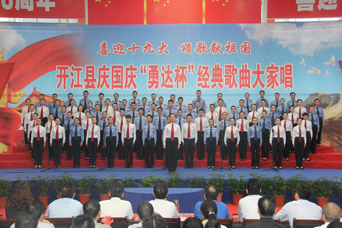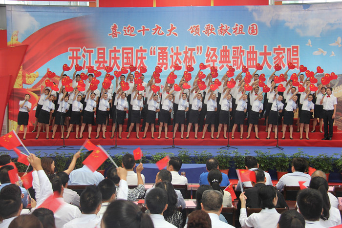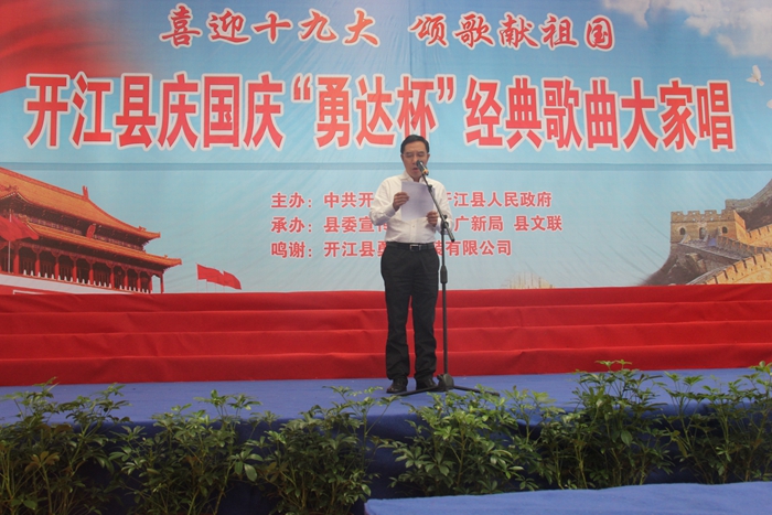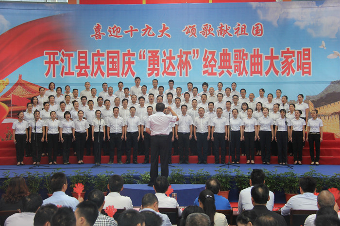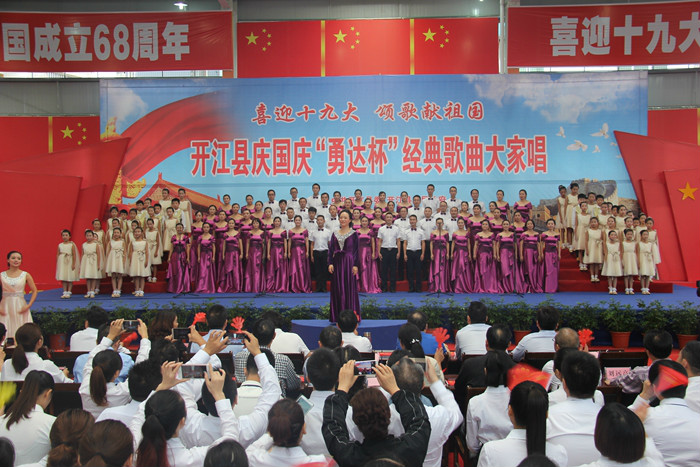 为恭贺中华人民共和国68周年华诞,迎接党的十九大胜利召开。2017年9月28日,由中共开江县委、县人民政府主办,县委宣传部、县文广新局、县文联承办的“喜迎十九大·颂歌献祖国”开江县庆国庆“永达杯”经典歌曲大家唱活动,在县体育局城东体育馆隆重举行。县委书记罗建致辞,县委、县人大、县政府、县政协在家领导出席活动。