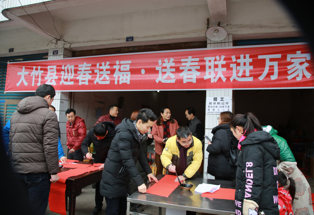 墨香四溢迎新春,春联福字暖民心。为深入贯彻落实党的十九大精神,弘扬中华民族传统文化,丰富广大群众的精神文化生活,营造欢乐祥和的节日氛围,2月10日上午,大竹县文化馆协手大竹县美术书法协会组织开展“迎春送福·送春联进万家”活动,活动邀请了县内知名艺术家杨先云以及其他书法家,现场为群众书写了近千幅春联。