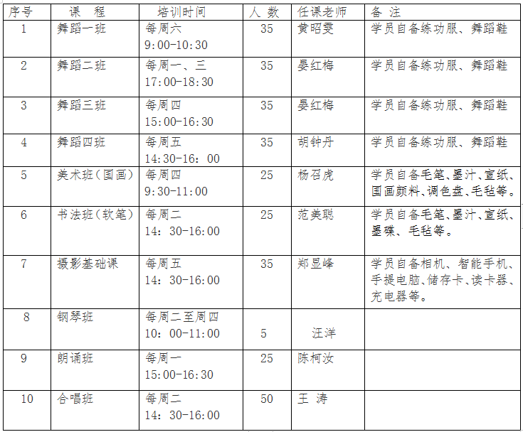 1.各类培训班均为群众艺术普及班,每年两学期分春季班和秋季班。