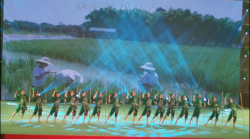 开江县选送的《薅秧妞妞》代表达州市参与了该次展演活动。《薅秧妞妞》是根据省级非遗《薅秧歌》创作的广场舞。姑娘们头戴斗笠,手持薅秧棍,用自己得体优美的舞姿再现了当年水田薅秧时欢歌笑语、热火朝天的劳动场景,同时展现了“川东小平原”稻田联片、秧苗繁茂、丰收在望的喜人景象。这群青春靓丽的薅秧妞妞随着动人的旋律,用热情奔放的舞姿征服了观众,现场不时爆发出阵阵掌声。