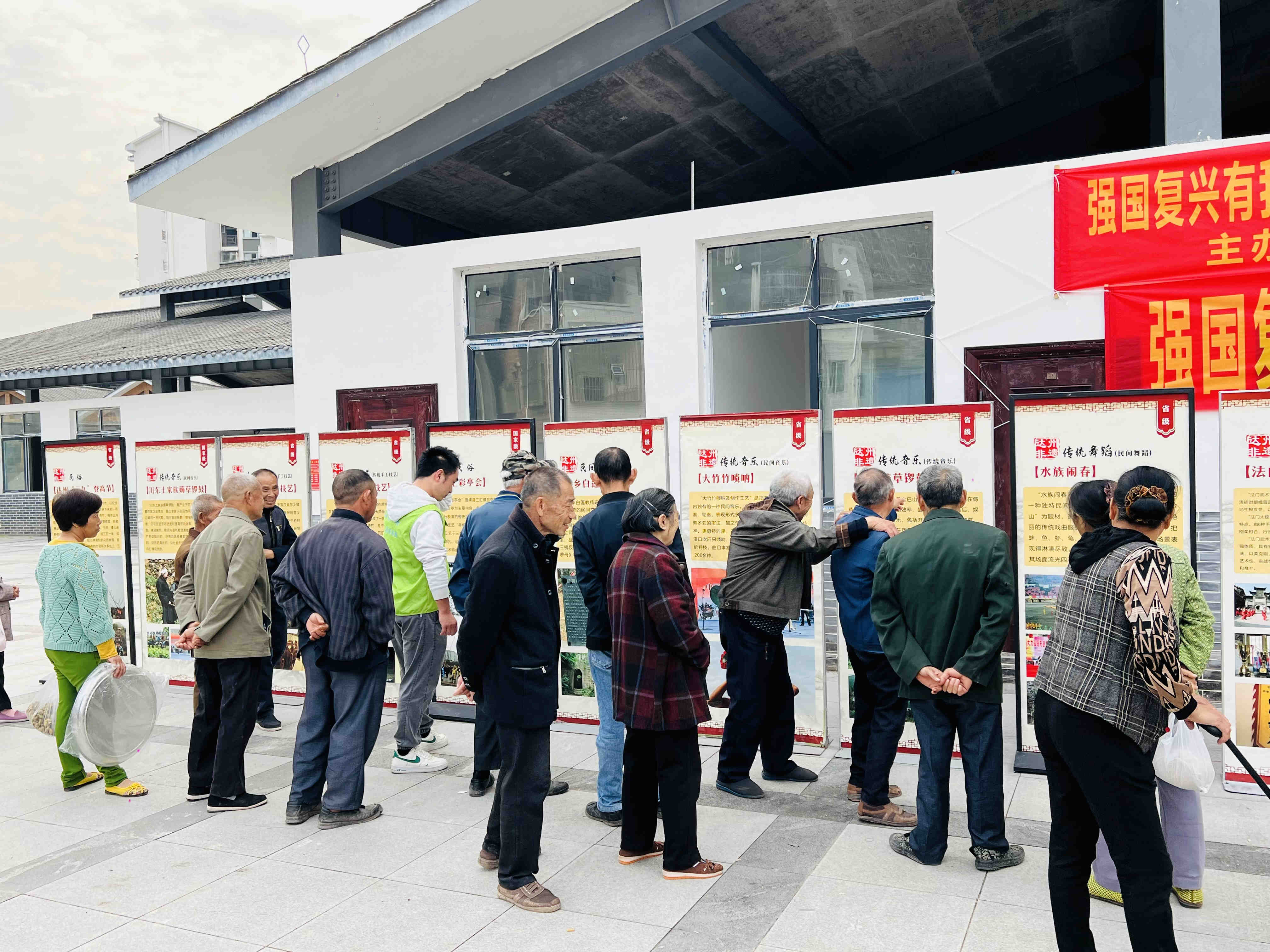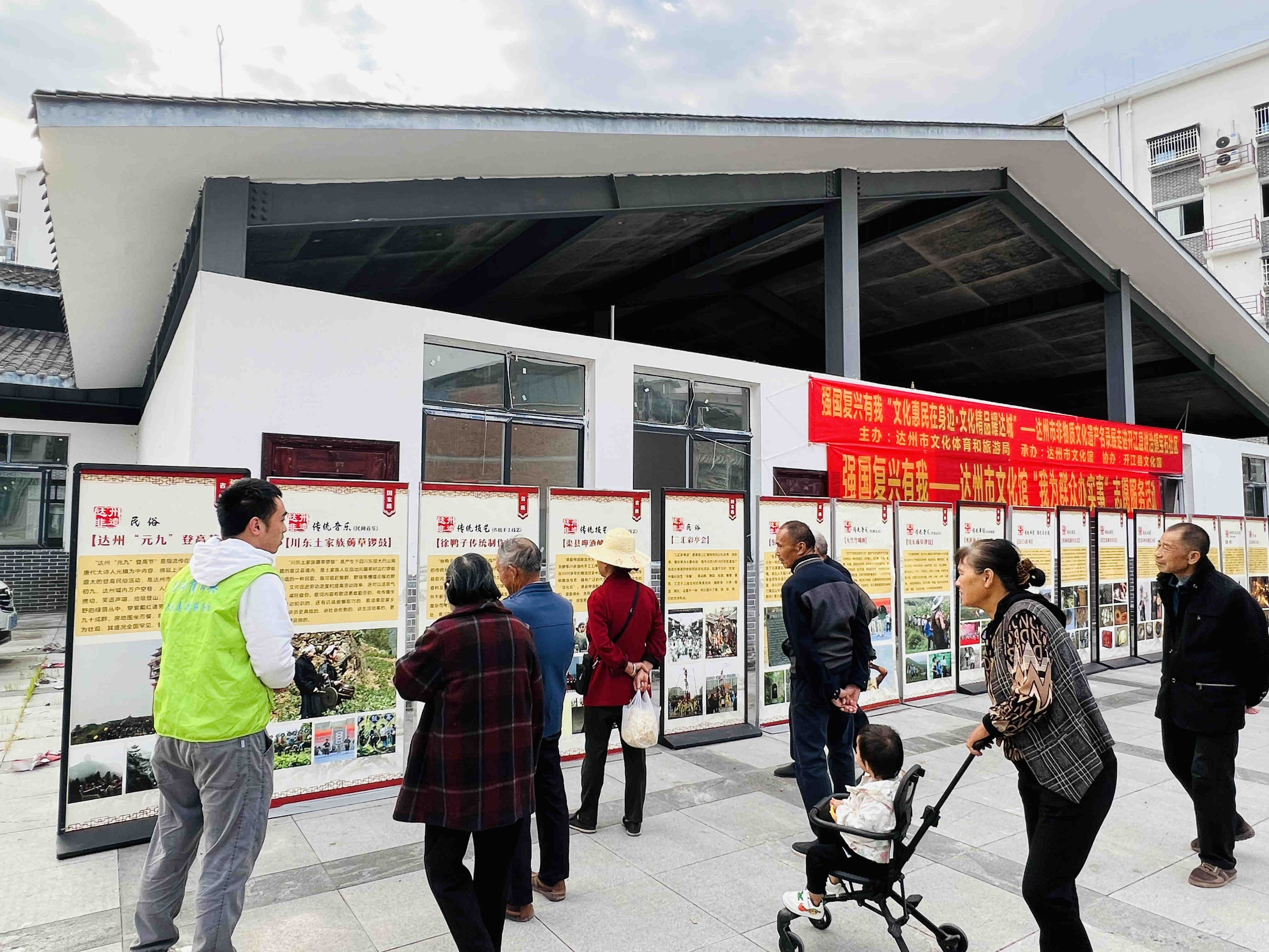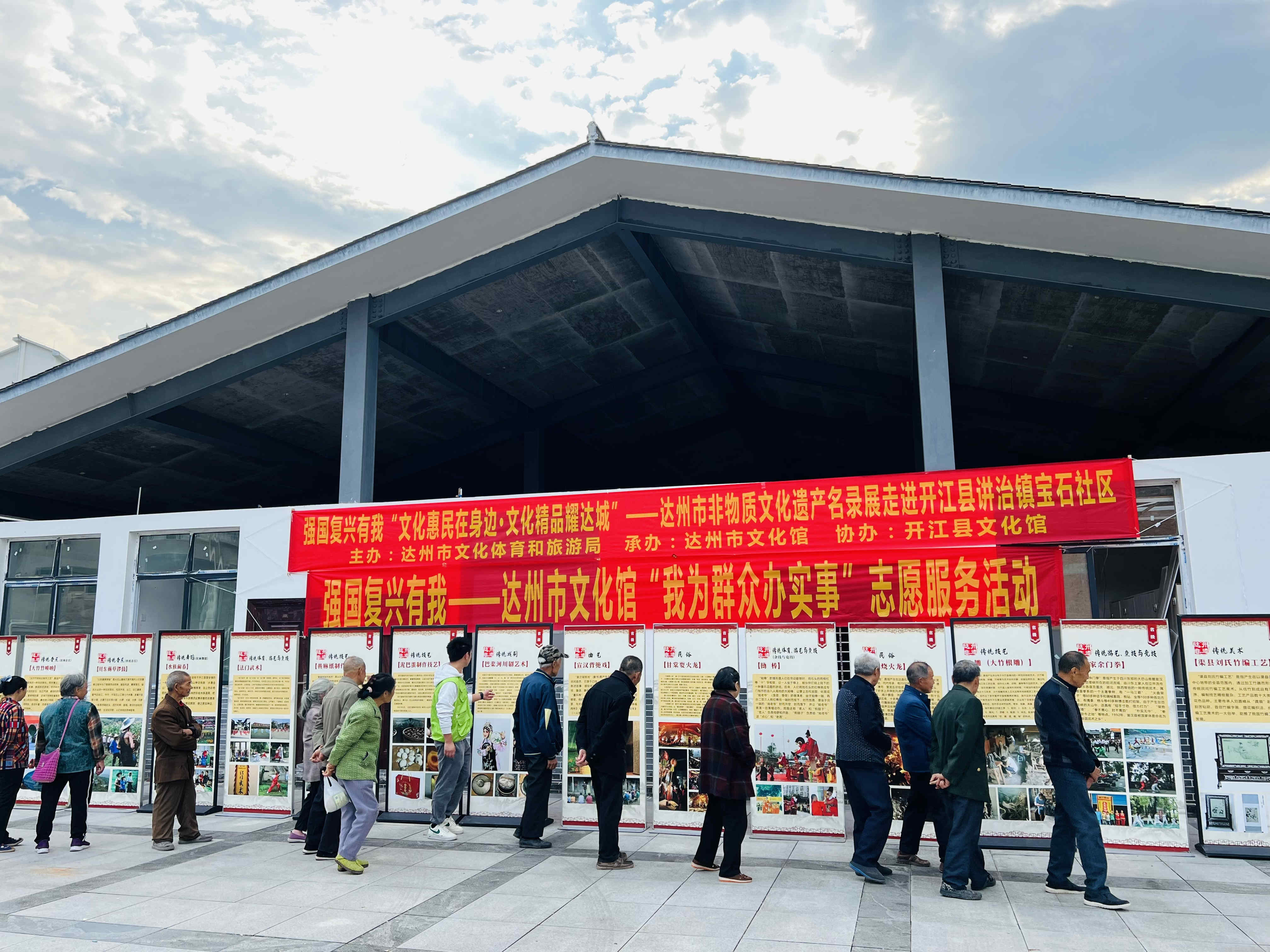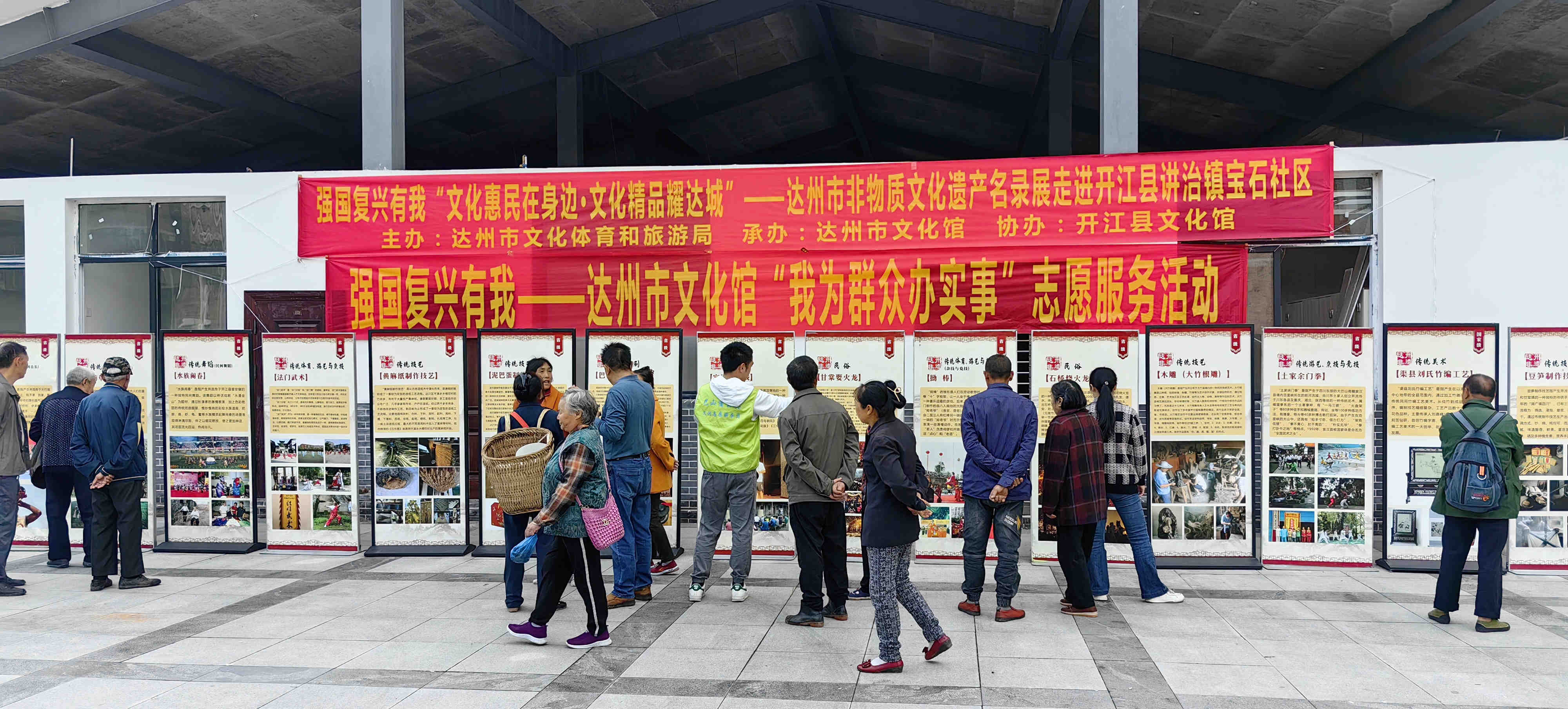 为弘扬中华民族优秀传统文化,增强全民文化遗产保护意识,促进非物质文化遗产在广大群众中更好的传承,让非遗文化更好地融入现代生活。由达州市文化体育和旅游局主办,达州市文化馆承办,开江县文化馆协办的“文化惠民在身边·文化精品耀达城”—达州市非物质文化遗产名录展于10月18日走进开江县讲治镇宝石社区。此次非遗名录展展出了国家级非遗名录渠县刘氏竹编、宣汉土家族薅草锣鼓、渠县三汇彩亭会、安仁板凳龙,省级非遗名录开江豆笋制作工艺、巴山背二歌、元九登高节等,非遗名录展以图文并茂的形式为当地居民送上了一场丰富多彩的非遗展览。